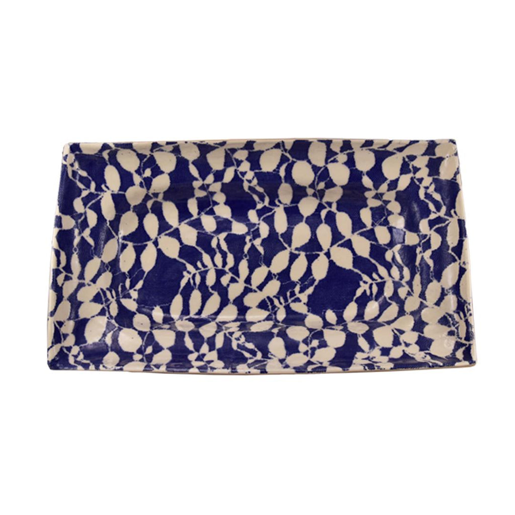 Alive with color and texture, this ceramic dish by Terrafirma is functional as it is beautiful. Using fabric and lace as a stencil to create this aspen pattern in the color cobalt, the dish is ideal for every day use. With bold patterns and colors, mix and match with other dinnerware for a unique table setting! Dishwasher safe. Measures 15.5" long x 8.75" wide x 2.75" tall. Handcrafted in the US.