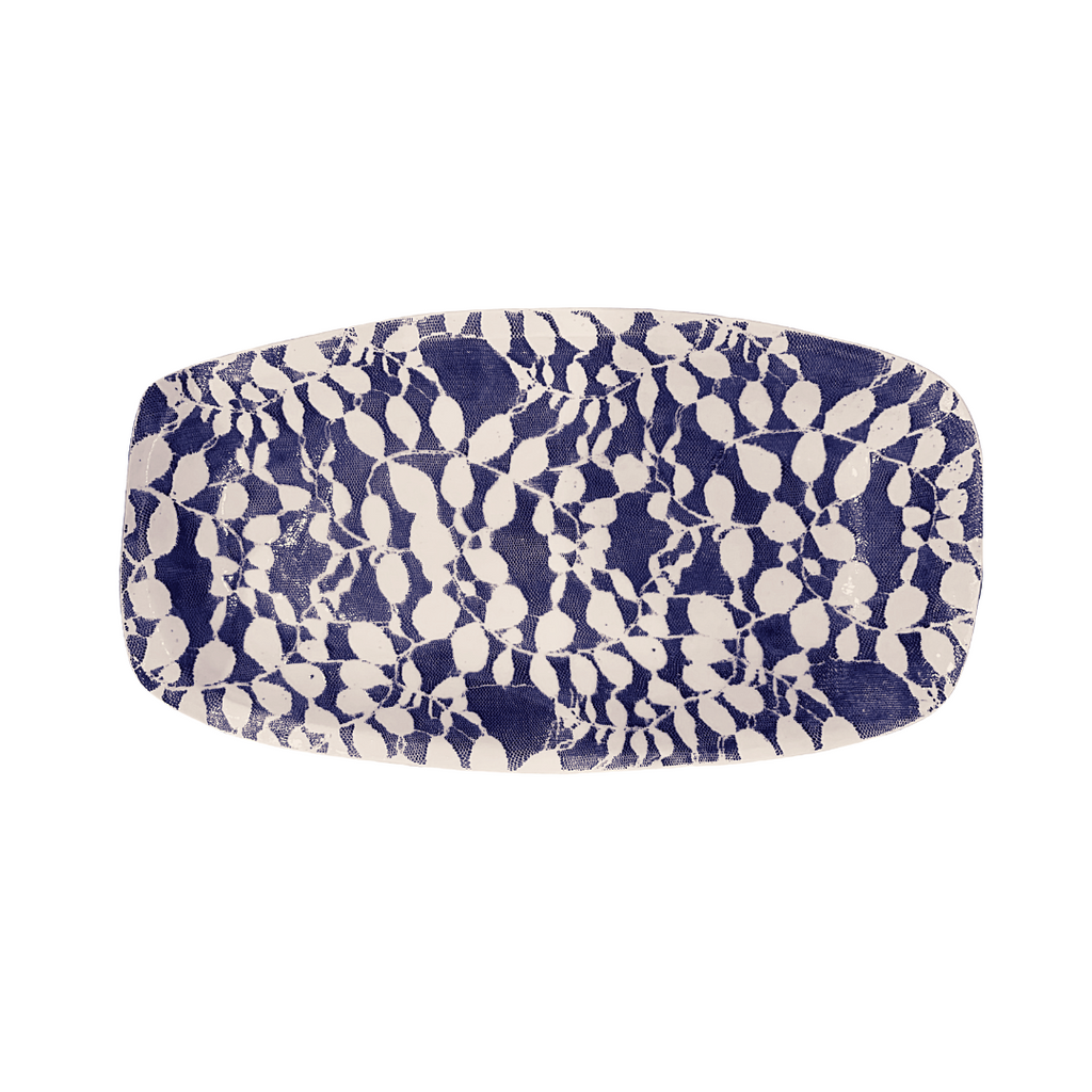 This large oblong platter by Terrafirma is functional as it is beautiful. Using fabric and lace as a stencil to create a striking "aspen" pattern, this cobalt blue ceramic platter is great for everyday use and for entertaining. Enhance your table and combine with other pieces by the artist for a unique table setting! Dishwasher safe. Measures 14.5” x 8”. Handmade in the US.