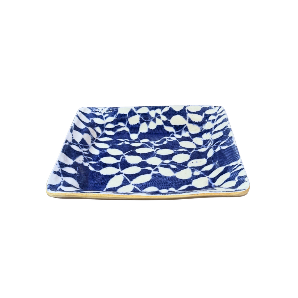 Alive with color and texture, this ceramic dish is as functional as it is beautiful. Using fabric and lace as a stencil to create the aspen pattern in cobalt color, the dish is ideal for every day use and will add to your decor. With bold patterns and colors, mix and match with other dinnerware for a unique table setting! Dishwasher safe. Measures 9.5 x 8 inches and 1.5 inches deep. Made in the US.