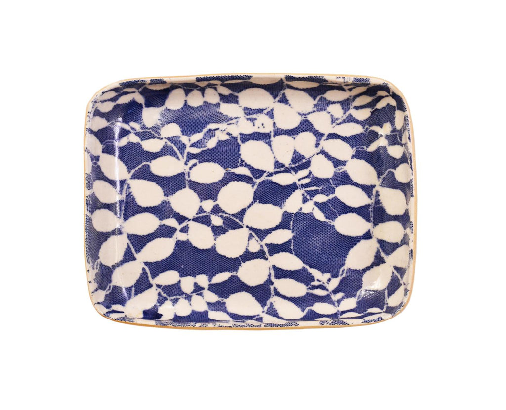 Alive with color and texture, this ceramic tidbit bowl by Terrafirma is as functional as it is beautiful. Using fabric and lace as a stencil to create this aspen pattern in the rich color of cobalt, the tidbit bowl is ideal for every day use and will add to your decor. With bold patterns and colors, mix and match with other dinnerware for a unique table setting! Dishwasher safe. Measures 8.5 x 6.75 x 1.25 inches. Made in the US.