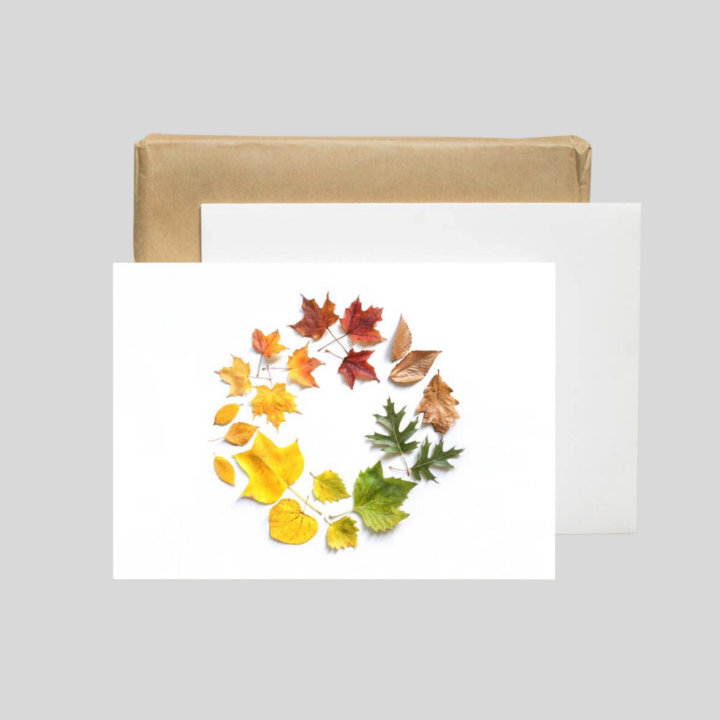 Created from a photo of fresh specimens, this Autumn Leaf Wreath card by Bottle Branch is a beautiful way to help commemorate any occasion. Printed on an appealingly soft and hefty card stock that is a delight to touch and use. The card measures 4.25" x 5.5" and includes a matching envelope. Inside is blank. Packaged sustainably in plant-based, compostable cello envelope.