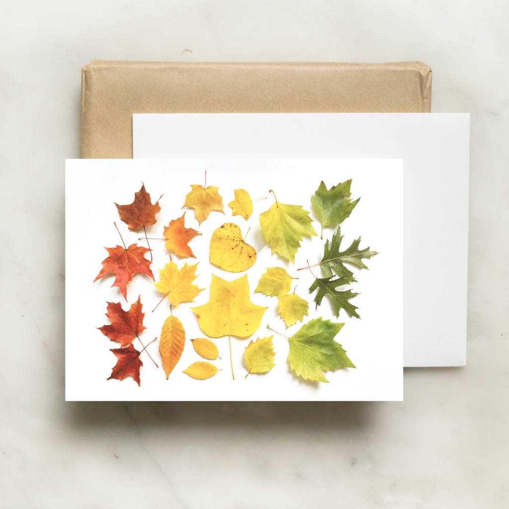 Created from a photo of fresh specimens, this Autumn Leaf Ombre card by Bottle Branch is a beautiful way to help commemorate any occasion. Printed on an appealingly soft and hefty card stock that is a delight to touch and use. The card measures 4.25" x 5.5" and includes a matching envelope. Inside is blank. Packaged sustainably in plant-based, compostable cello envelope.