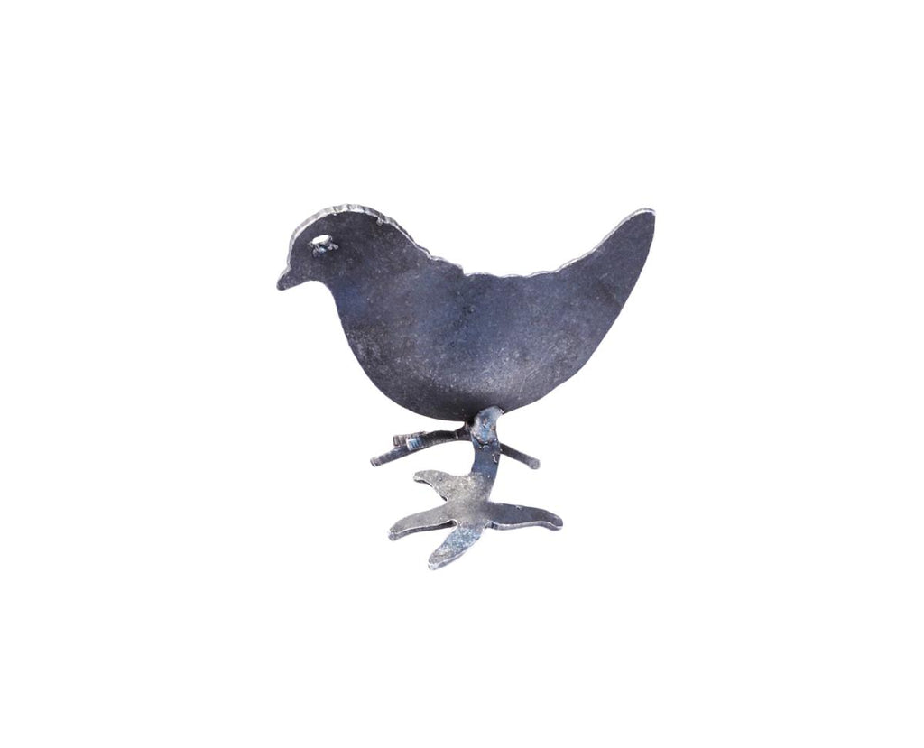 This hand-forged baby chick by Blackthorne Forge is a perfect union of function and sculpture. Combining traditional ironwork with contemporary design, it will add a rustic modern feel to any space. Made of iron (natural oiled-metal finish). Measures 3.75 inches long by 3.25 inches tall . Handcrafted in the US.