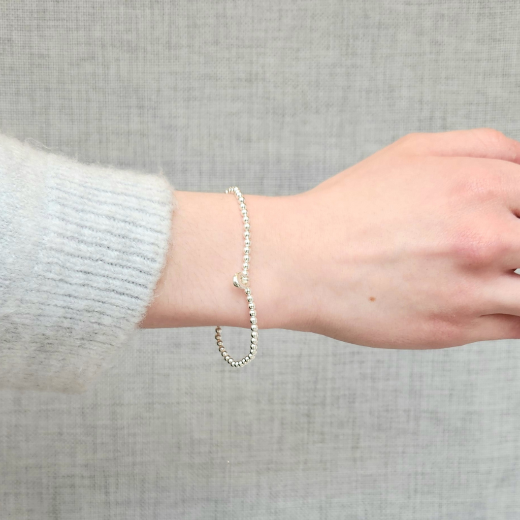 Cast from stones with a hole found on the beaches of Gimli, Manitoba, Canada, Johanna Brierley's jewelry embraces the organic beauty created by nature. Hole stones are believed to channel good luck, and thus the artist creates simple, long-lasting pieces that symbolize luck and fortune. Made with 3mm round silver beads, this stretchie bracelet features the artist's 'baby' sterling silver lucky stone! Bracelet measures 7". Handcrafted in Canada.