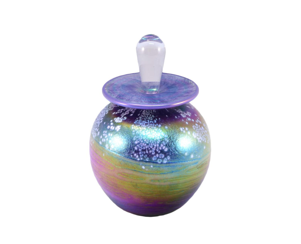 Texture and iridescence are finely illustrated in this handblown glass perfume bottle by Tom Stoenner from the artist's Luster Series. The simple forms combined with the use of opalescent colors create a beautiful statement in your home. Measures 4.75in high. Handcrafted in US.
