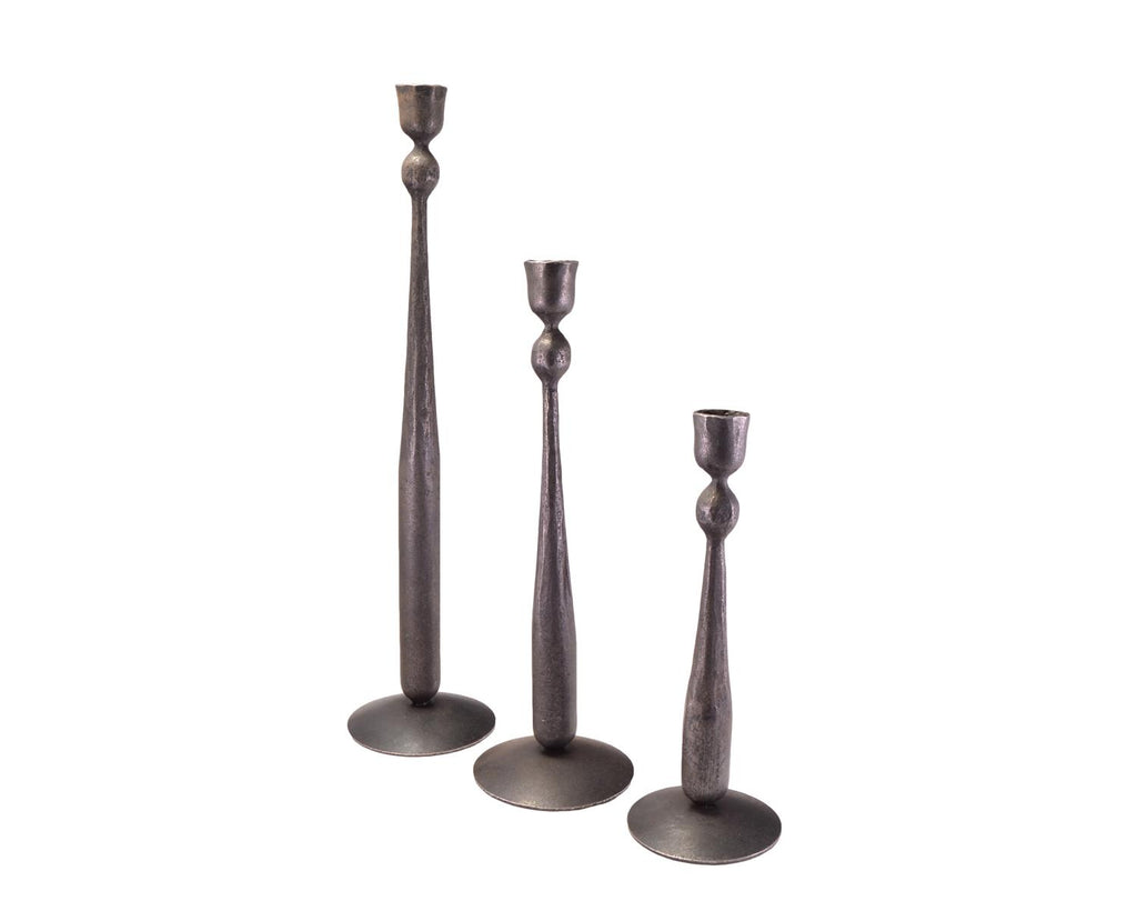 This hand-forged candle holder trio by Blackthorne Forge is a perfect union of function and sculpture. Combining traditional ironwork with contemporary design, these holders will add a rustic modern feel to any space. Made of iron (natural oiled-metal finish). Measures 16, 12, and 9 inches tall. Handcrafted in the US.