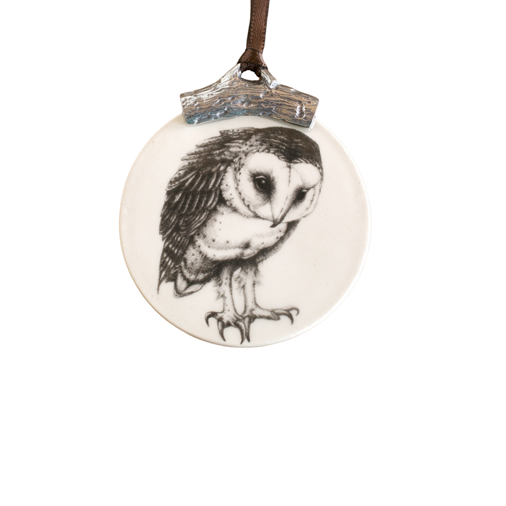 Welcome to the charm and serenity that is nature into your home with a beautiful Laura Zindel piece! This ceramic ornament adorns the artist's original illustration of a barn owl and is topped with a pewter branch. Measures 2.5 inches in diameter. Handcrafted in US.