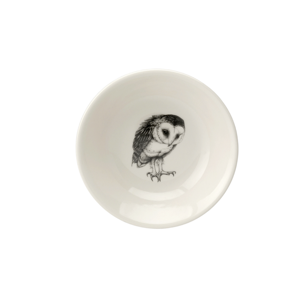 Welcome to the charm and serenity that is nature into your home with a beautiful Laura Zindel piece! Both functional and decorative, this bowl adorns the artist's original illustration of a barn owl. Made from high-resistance white china. Measures 4.75" wide and 1.25" deep. Microwave and dishwasher safe. Handcrafted in US.