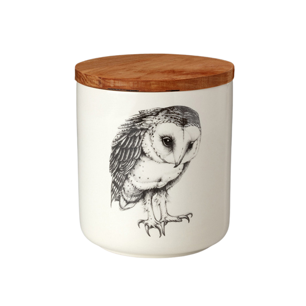 Welcome to the charm and serenity that is nature into your home with a beautiful Laura Zindel piece! Both functional and decorative, this small canister adorns the artist's original illustration of a barn owl. Made from earthenware and glazed with non-toxic, low-fire glazes, with a Maple wood lid. Measures 5.75 x 5 inches. Handcrafted in US. Hand wash with warm soapy water. Avoid dishwasher, oven, or microwave use.