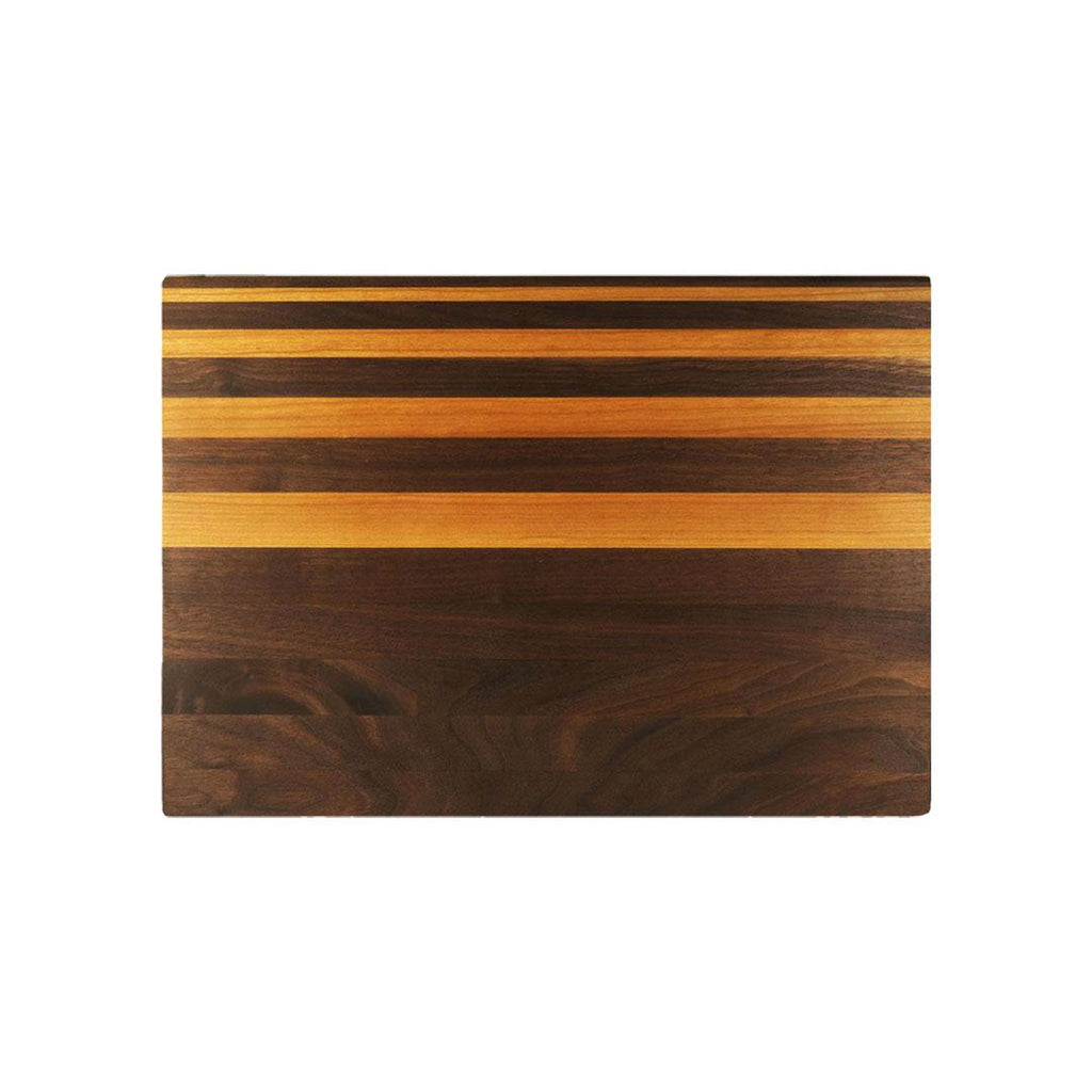 This cutting board by Sam LaBonte is the perfect combination of beauty and function! Made of walnut and cherry, this board features a striped pattern. Measures 14" long x 9.75" wide x 1" tall. Handcrafted in US.