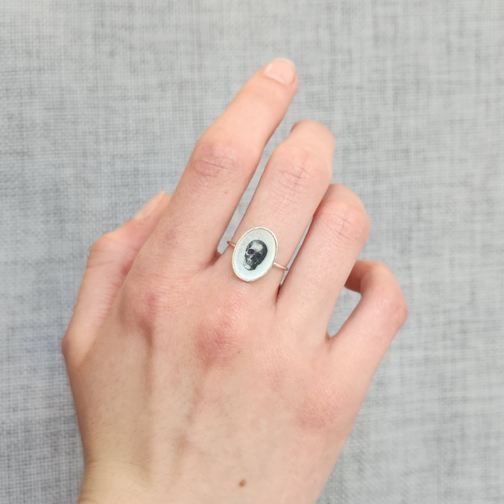 With her antique-inspired palate, Anzu Jewelry evokes a sense of the nostalgic past with her elegant, illustrated motifs. This ring feature the artist's hand drawing of a skull on special plastic that she uses as her canvas. Made with sterling silver, the top part of the ring measures 0.43” wide and 0.56” tall. The ring size is 6.25. Because each piece is hand drawn and forged by the artist, each piece is truly unique and will show variations. Handmade in Stuttgart, Germany.