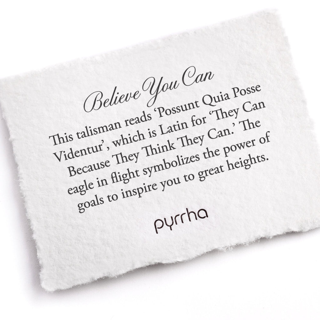 Cast using authentic wax seals and imagery from the Victorian Era, Pyrrha talismans are designed to inspire the wearer with its heralded meaning. This talisman reads 'Possunt Quia Posse Videntur', which is Latin for 'They Can Because They Think They Can.' The eagle in flight symbolizes the power of goals to inspire you to great heights. Made of 100% recycled sterling silver, the pendant measures 0.64" x 0.66". The chain is 18". Comes with a meaning card. Handcrafted in Vancouver, Canada.
