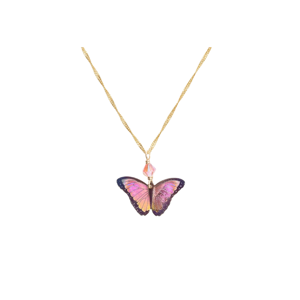 Wear this delicate butterfly necklace by Holly Yashi for a soft, subtle look. This niobium and gold overlay necklace has a light pink bead on top of the coral butterfly. Pendant measures 0.75" L x 0.75" W. The adjustable gold overlay chain can be worn at 16", 18", and 20". Handcrafted in US.