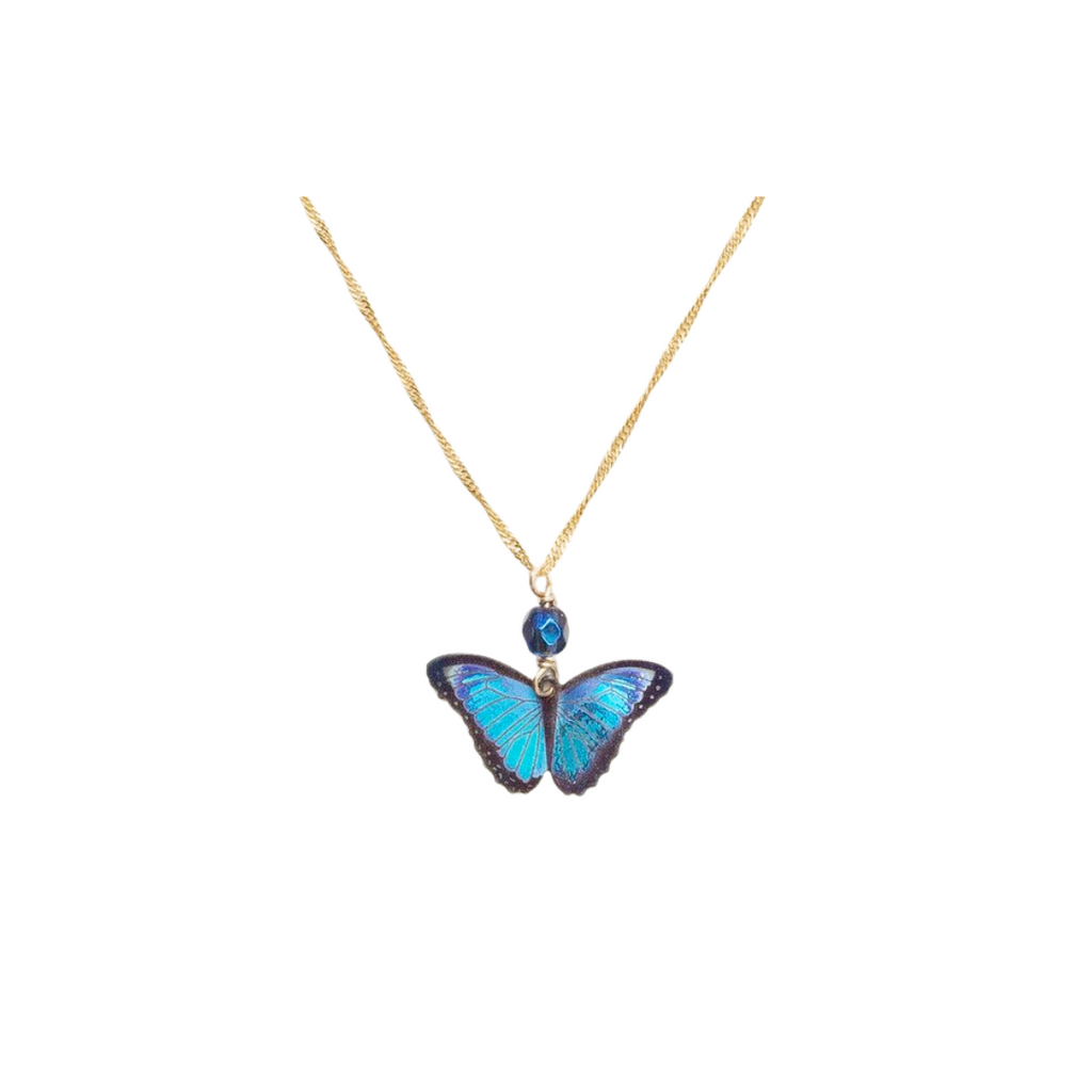 Wear this delicate butterfly necklace by Holly Yashi for a soft, subtle look. This niobium and gold overlay necklace has a blue crystal on top of the blue butterfly. Pendant measures 0.75" L x 0.75" W. The adjustable gold overlay chain can be worn at 16", 18", and 20". Handcrafted in US.