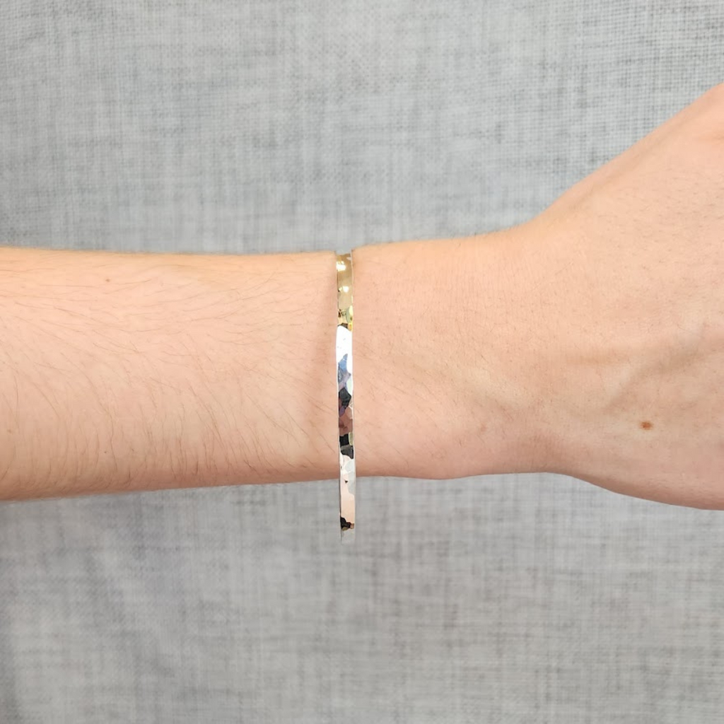 Peter James jewelry combines elegant flowing shapes with classic and timeless designs, materials, and finishes. Each piece is handmade in San Rafael, CA using nickel free sterling silver. There might be slight variation due to being handmade, and no two pieces are exactly the same. The Belt Bangle measures 8.25" in length/circumference around the wrist and 0.13" wide.