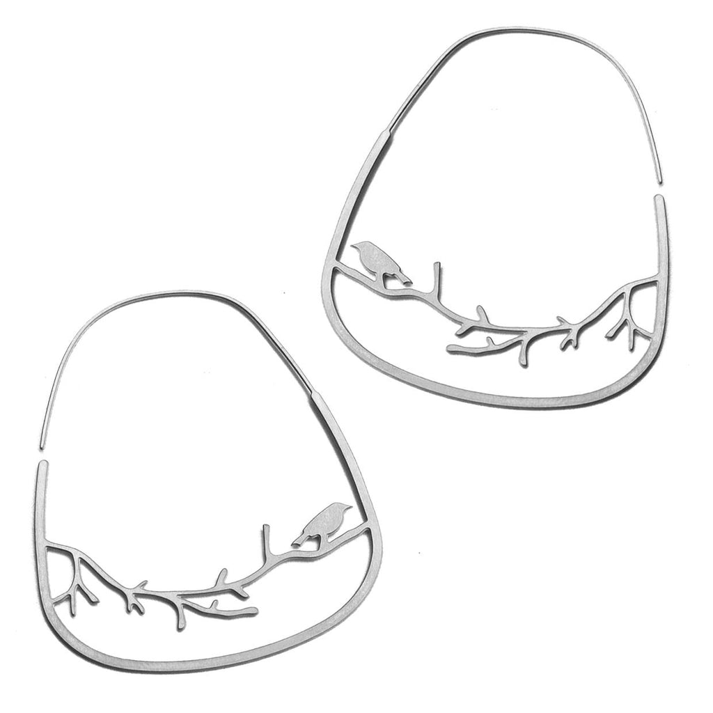 Redolent of shapes and patterns found in nature and in textiles, these stainless steel hoops by Daphne Olive are elegant, yet bold and fun to wear. Made of stainless steel, the hoops measure 2 inches x 1.65 inches. Handcrafted in US.