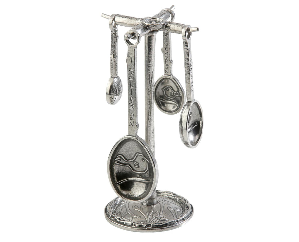 Enjoy cooking and baking with these utilitarian and decorative measuring spoons by Crosby and Taylor. The set, which includes four spoons and a display post, features a sweet bird in each bowl with the spoon size indicated on each handle. The post resembles a tree with a nest and eggs at the top. Pewter spoons and post. 6.5” tall and 4” wide. Handcrafted in US.