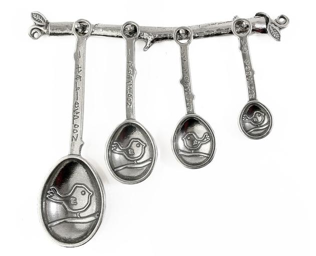 Enjoy cooking and baking with these utilitarian and decorative measuring spoons by Crosby and Taylor. The set, which includes four spoons and a display strip, features a sweet bird in each bowl and the spoon size indicated on each handle. The strip, which mounts to the wall, resembles a tree branch. Pewter spoons and post. The strip is 7.0" long. Handcrafted in US.