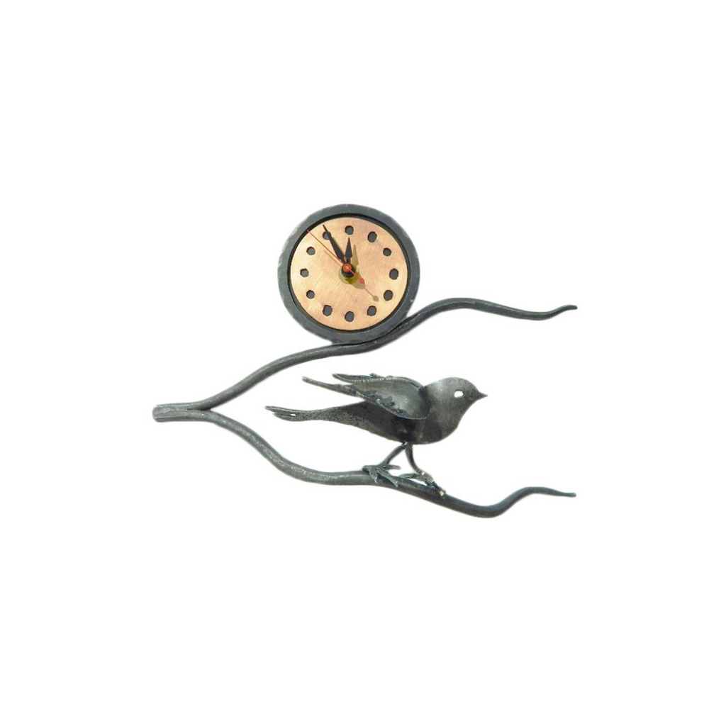 This hand-forged wall clock by Blackthorne Forge is a perfect union of function and sculpture. Combining traditional ironwork with a contemporary design, the clock adds a rustic modern feel to any space. Made of iron (natural oiled-metal finish) with a copper face. Measures 13.5 inches wide x 10 inches high x 2.5 inches deep. Handcrafted in US. Includes a battery operated quartz mechanism with a second hand. Battery not included.