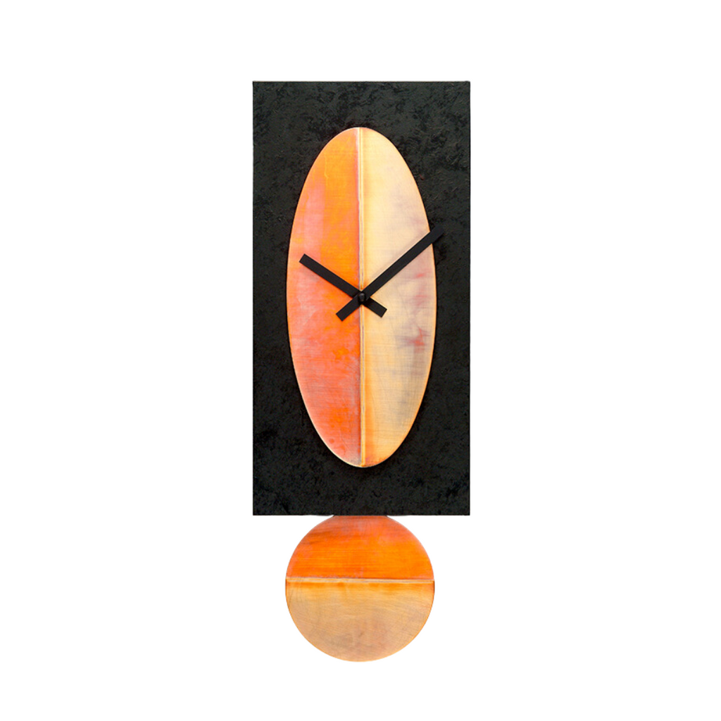 Combining the simplicity of line with the complexity of color, this clock by Leonie Lacouette has a modern look with a rustic edge. Made from patinated copper layered over hand-painted black wooden background. Clock mechanism runs on AA batteries. Batteries not included. Measures 22" x 8". Each piece is unique; patina colors will vary slightly. Handcrafted in the US.