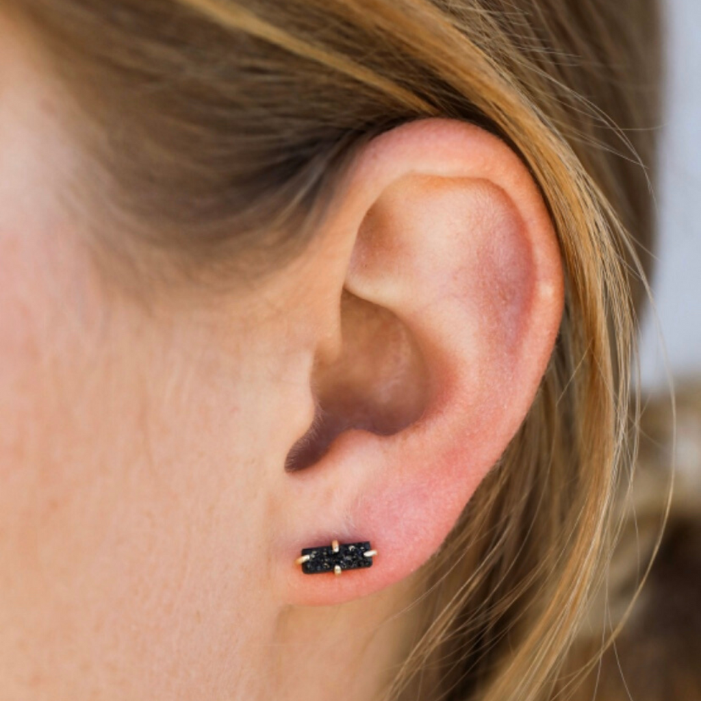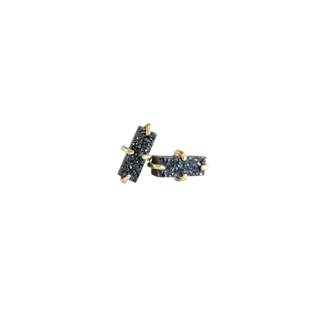 Natural black druzy stones are set into a simple four-prong 18k yellow gold plated setting over sterling silver by JaxKelly. Measures approximately 1/4". Each stone is unique and varies slightly in color and size. Handmade in US.
