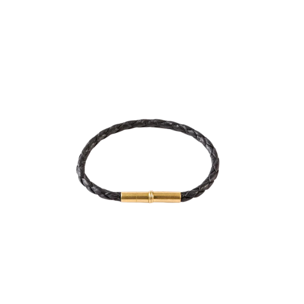 This Flint bracelet by Aaron Boyd of Tres Cuervos gives a rustic and rugged look to any outfit. Made with black braided waxed canvas cord, and the magnetic closure is made with reconditioned .22 shells. Measures approximately 7.25". Limit contact with water. Canvas and brass naturally darken over time, and add to the authentic, rustic look. Handcrafted in US.