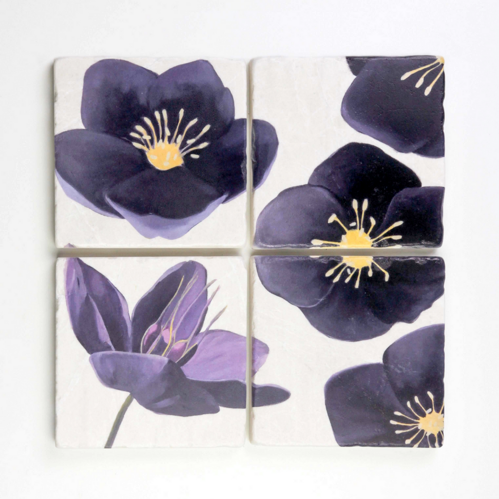 Enjoy nature and its beauty in this coaster set by India and Purry. Derived from the artist's original oil paintings, these marble coasters are both functional and lovely displayed in your home. A set of four with cork backing, each coaster measures 4 inches. Due to the nature of marble, each coaster is unique. Handcrafted in US.