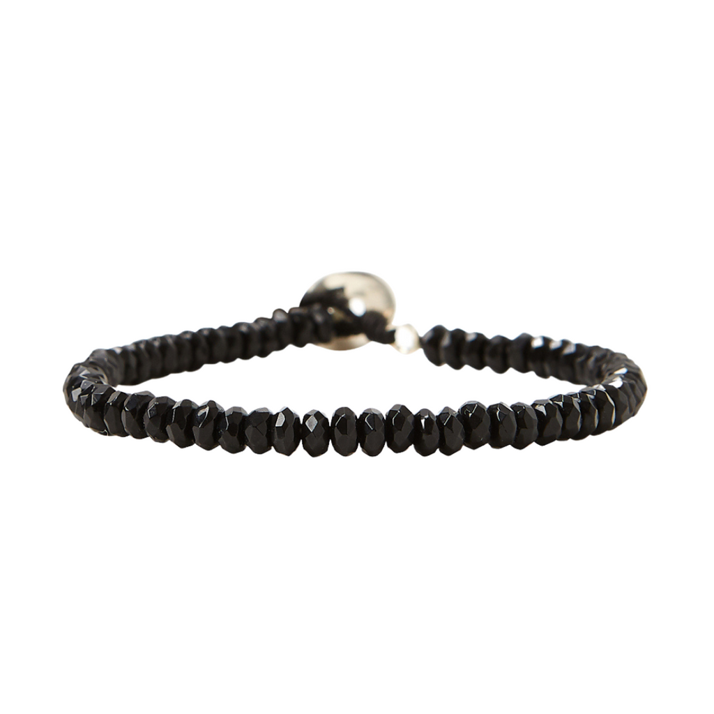 This adjustable bracelet by Chan Luu will add bohemian flair to any outfit! Made of black onyx beads with an adjustable sterling silver signature oval button. Measures 6 inches. Handmade in Vietnam.