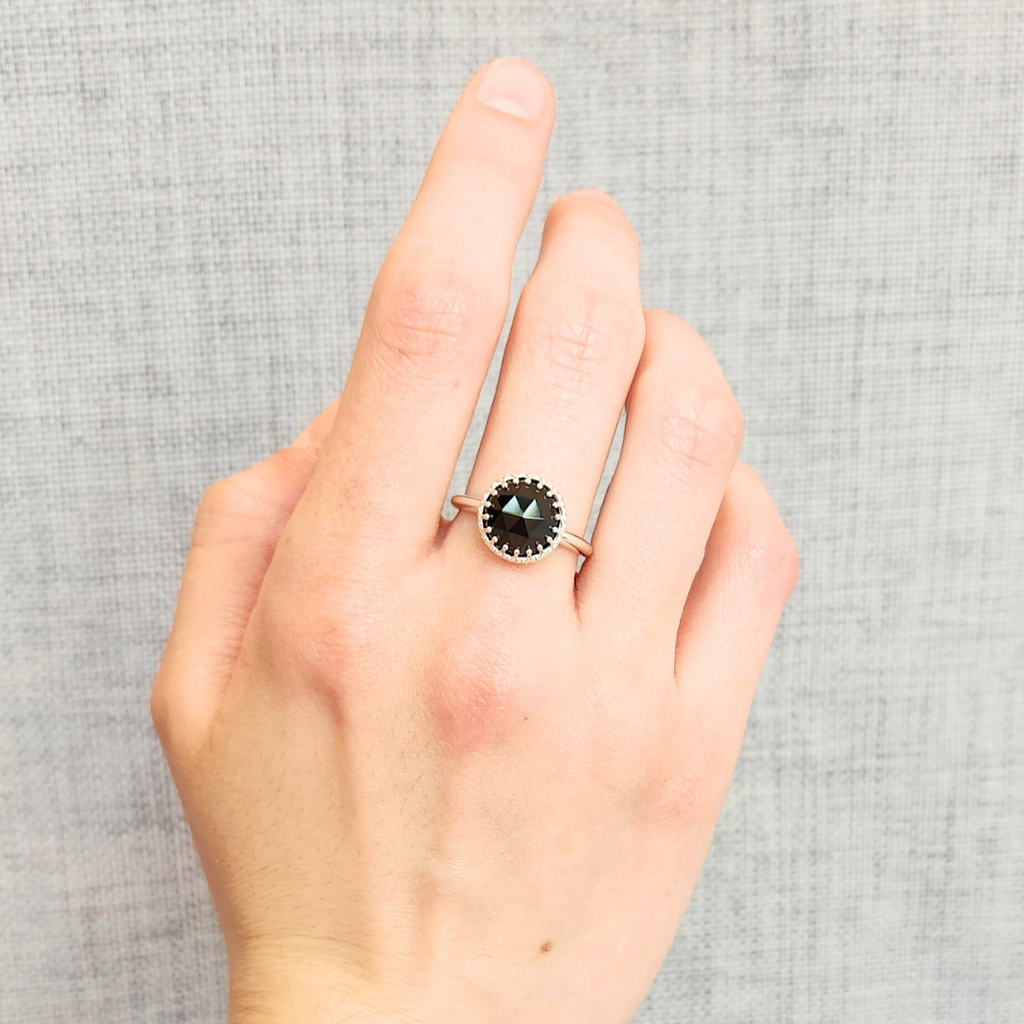 Handmade locally by our wonderful custom designer, Tobi Sznajderman! This sterling silver ring features a 10mm rose cut black spinel set in a crown bezel. The top of the ring measures approximately 0.44" in diameter, and the band is 2mm wide. The ring is a size 7. Handmade in the US.