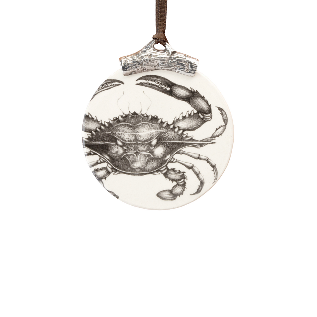 Welcome to the charm and serenity that is nature into your home with a beautiful Laura Zindel piece! This ceramic ornament adorns the artist's original illustration of a blue crab and is topped with a pewter branch. Measures 2.5 inches in diameter. Handcrafted in US.