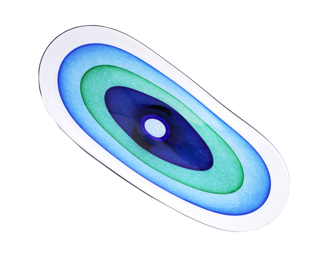 Elegant shapes and stunning colors define the Saturn Bowls by Teign Valley Glass! Hand-blown in the rich color of blue and green, the bowl measures approx. 17 inches long by 8 inches wide by 5 inches high. Handcrafted in England.