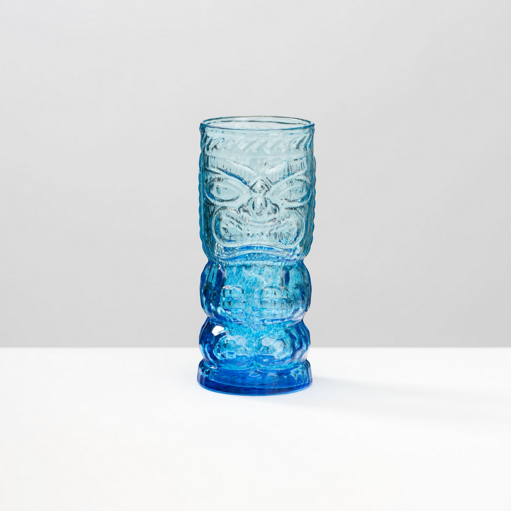 Sip on your favorite tropical cocktails from a mold blown glass tiki mug handcrafted by Andrew Iannazzi. This blue OG glass tiki mug is dishwasher safe, but hand washing is recommended and avoid boiling liquids or extreme temperature changes. Measures 6 inches tall. Due to the handcrafted nature of these glasses, there may be slight variations in size and detail. Handcrafted in US.