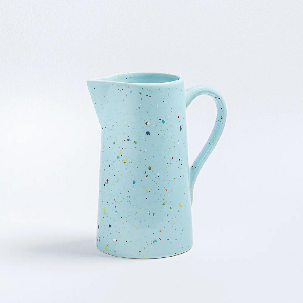 Serve your refreshments in this fun party pitcher by Egg Back Home! Handmade from earthenware, the bowl has a shiny glaze finish and a beautiful colorful palette. Measures approximately 7" wide (including handle) and 8.75" tall, and holds approzimately 57oz/1.7L. Microwave and dishwasher safe. Handmade in Portugal. Due to its handmade process, the pitchers all have natural and unique imperfections. No two are exactly alike. The glaze colors, reactions, and design of the item received may differ from the photo.