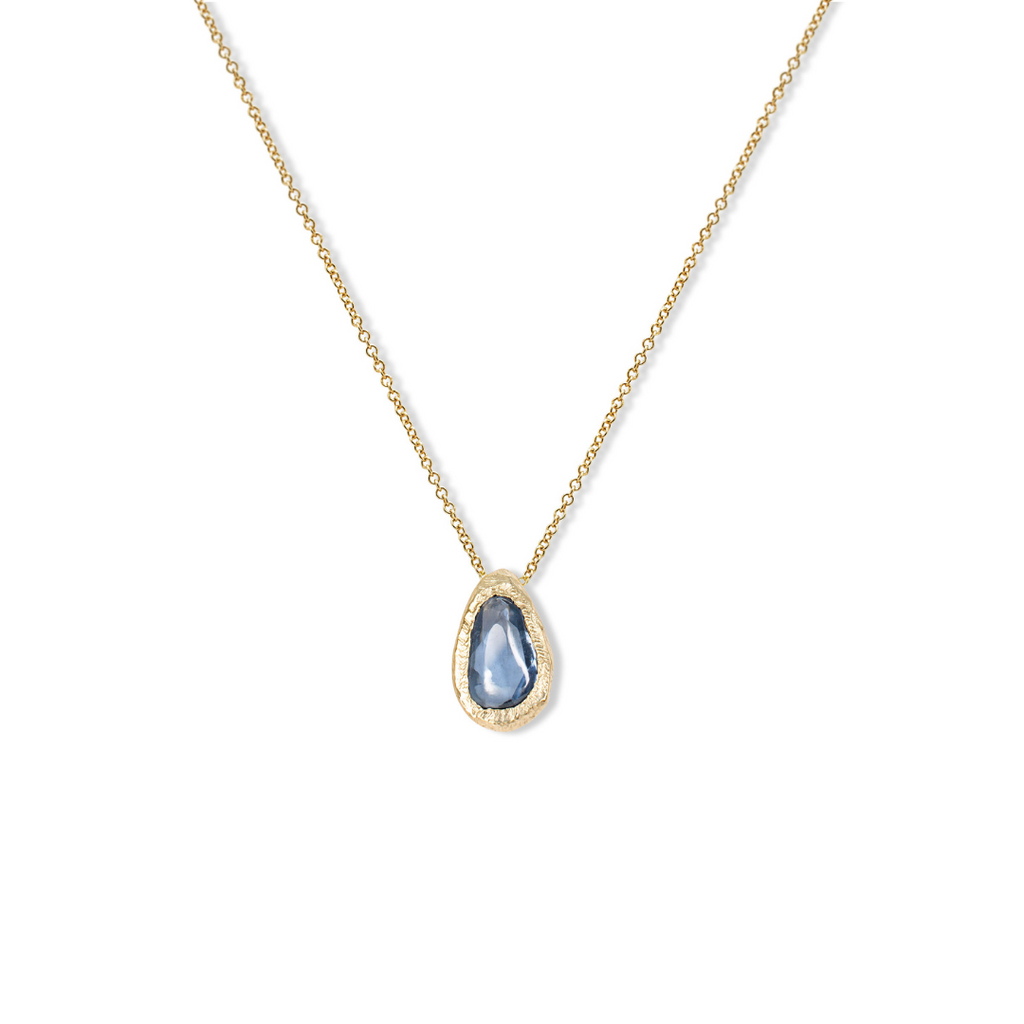 This textural slider necklace by Page Sargisson adds a sweet pop of color to any outfit! The pendant features a 1ct rose cut blue sapphire set in hand carved 18K yellow gold. Measures approximately 0.5" by 0.38" and hangs on an adjustable 16/18" chain. Each pendant is unique and handmade, so the size and color may vary from the photo. Handcrafted in US.