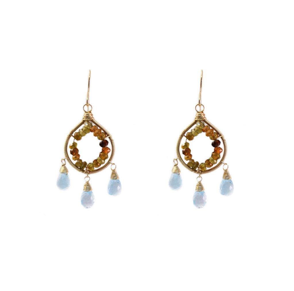 Elegant handcrafted wire wrapping meets colorful gemstones in Lina Tsui jewelry. These earrings are made of 14k yellow gold fill wire, blue topaz and tourmaline gemstones, and gold filled ear wires, and measure 1.63 x 0.63 inches. Handcrafted in US.