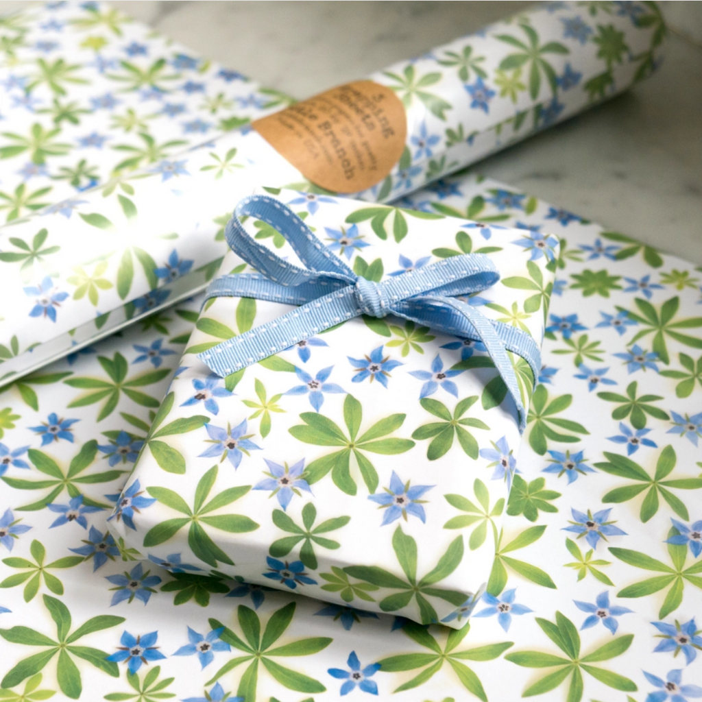 Created from a photo of fresh specimens, this Blue Woodruff and Borage wrapping paper by Bottle Branch is a beautiful way to bring your package to life. Sheets are perfect for wrapping presents, covering boxes, scrapbooking, and many other projects. Printed on luxurious, uncoated, text weight paper. Each sheet measures 20 by 29 inches. Three sheets per roll. Made in US.