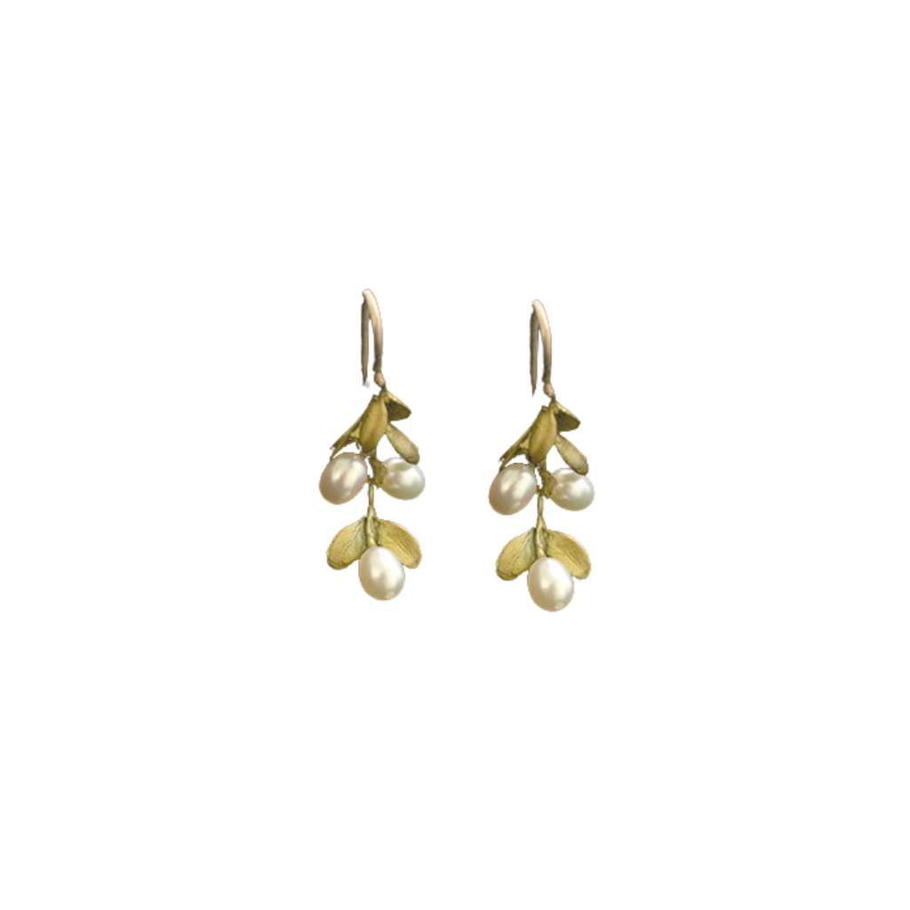 Behold nature and all its charm with these boxwood earrings by Silver Seasons. Made by creating molds directly from botanical elements, artist Michael Michaud effortlessly captures both the beauty and details of the actual flora. Made with white freshwater pearl and cast bronze with a soft green patina. The earrings are approximately 0.5" wide and 1.5" long from the top of the sterling silver ear wire to the bottom of the earring. Handmade in US.