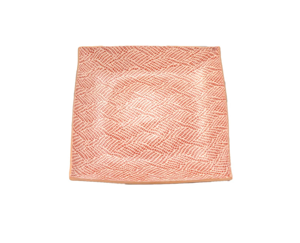 Alive with color and texture, this ceramic square by Terrafirma is as functional as it is beautiful. Using fabric and lace as a stencil to create this braid pattern in the rich color of poppy, the square is ideal for every day use and will add to your decor. With bold patterns and colors, mix and match with other dinnerware for a unique table setting! Dishwasher safe. Measures 13”. Made in the US.