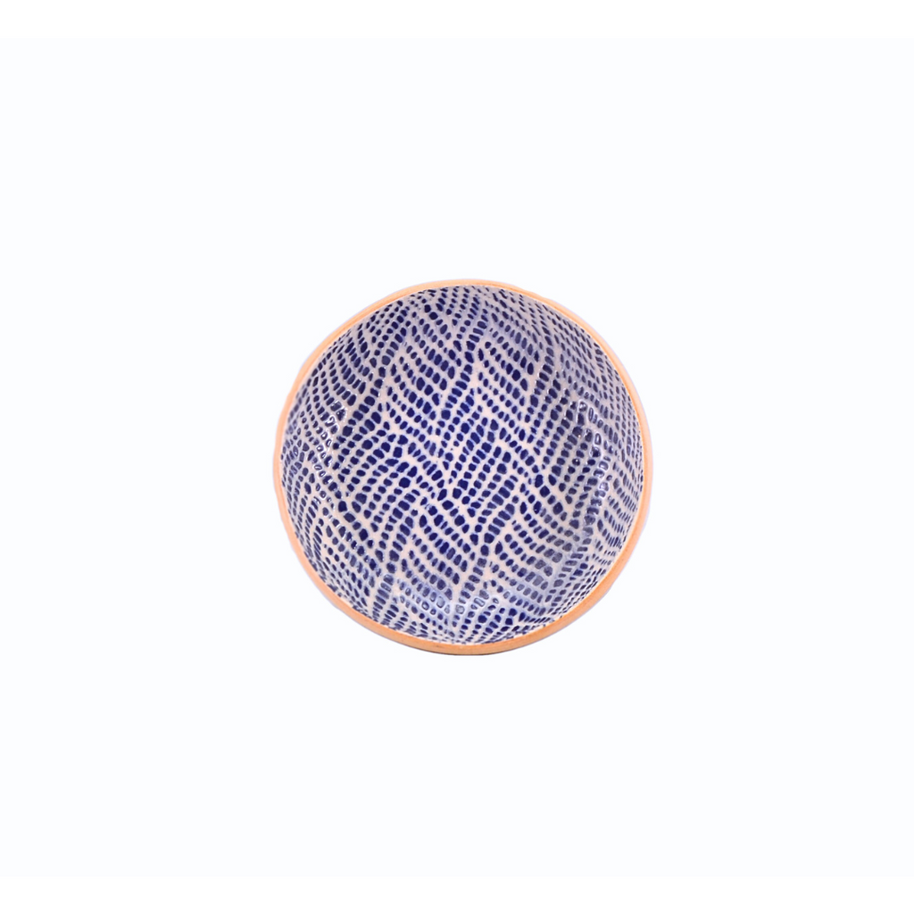 Alive with color and texture, this ceramic fruit dessert bowl is as functional as it is beautiful. Using fabric and lace as a stencil to create the braid pattern in cobalt color, the fruit dessert is ideal for every day use and will add to your decor. With bold patterns and colors, mix and match with other dinnerware for a unique table setting! Dishwasher safe. Measures 6.25 inches across and 1.5 inches tall. Made in the US.