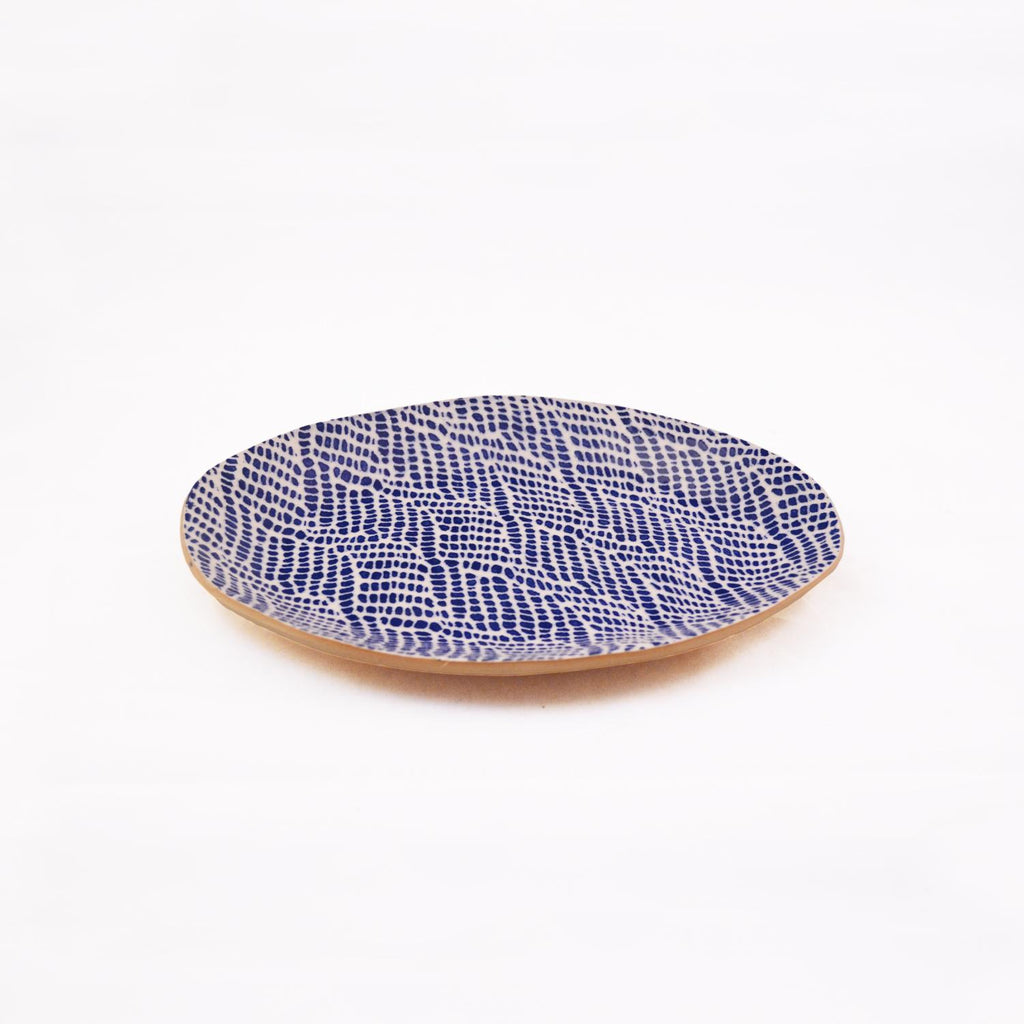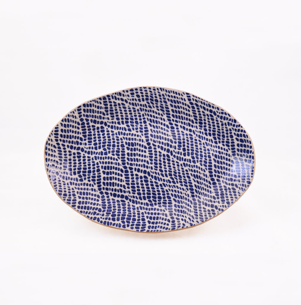 Alive with color and texture, this ceramic petite oval dish by Terrafirma is as functional as it is beautiful. Using fabric and lace as a stencil to create this braid pattern in the color of cobalt, the petitel oval is ideal for every day use and will add to your decor. With bold patterns and colors, mix and match with other dinnerware for a unique table setting! Dishwasher safe. Measures 9.5" x 6.5" x 1". Made in the US.