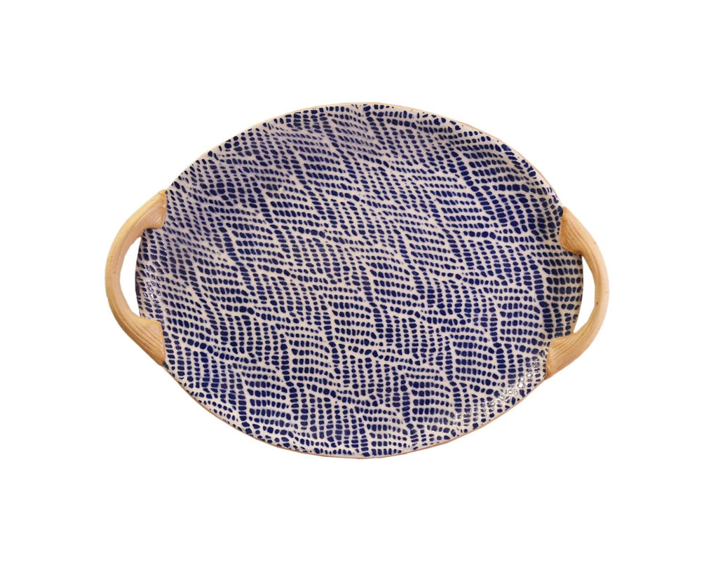 Alive with color and texture, this ceramic small oval with handles by Terrafirma is as functional as it is beautiful. Using fabric and lace as a stencil to create this braid pattern in the rich color of cobalt, the small oval with handles is ideal for every day use and will add to your decor. With bold patterns and colors, mix and match with other dinnerware for a unique table setting! Dishwasher safe. Measures 13 x 9.5 inches. Made in the US.