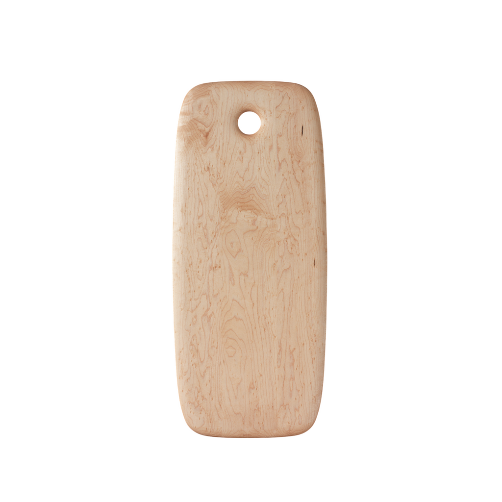 This cutting board by Edward Wohl is an art object that is designed to add aesthetic and utilitarian pleasure to your daily life. Made of solid bird's-eye maple, this board has graceful edges and a liquid-smooth finish. Measures 10 x 23 inches. Handcrafted in US. Woodgrain pattern will vary.