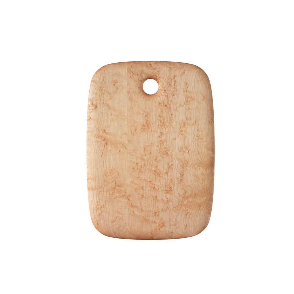 This cutting board by Edward Wohl is an art object that is designed to add aesthetic and utilitarian pleasure to your daily life. Made of solid bird's-eye maple, this board has graceful edges and a liquid-smooth finish. Measures 11 x 15.5 inches. Handcrafted in US. Woodgrain pattern will vary.