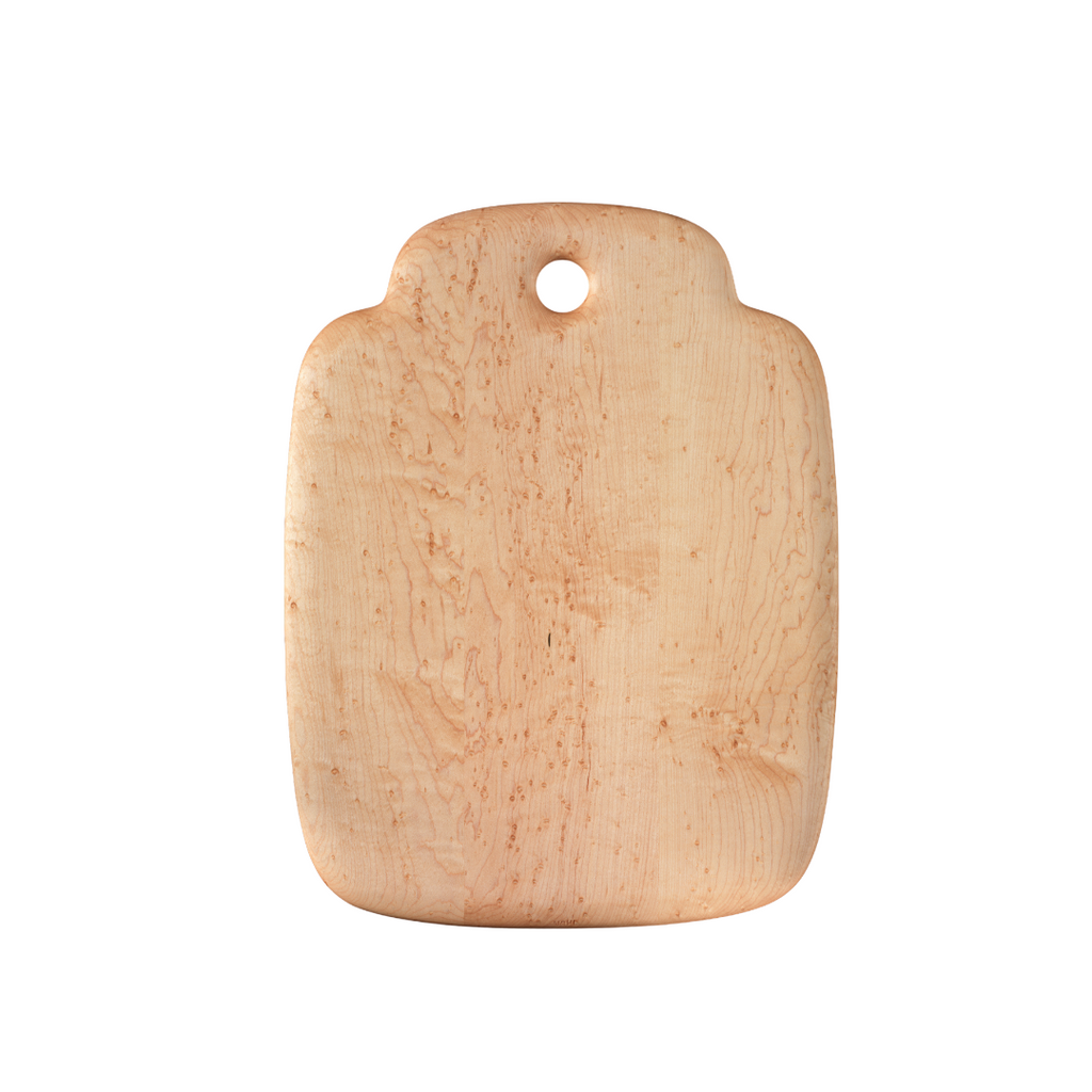 This cutting board by Edward Wohl is an art object that is designed to add aesthetic and utilitarian pleasure to your daily life. Made of solid bird's-eye maple, this board has graceful edges and a liquid-smooth finish. Measures 13 x 17 inches. Handcrafted in US. Woodgrain pattern will vary.