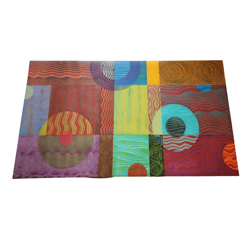 This one of a kind mat is hand painted with bright colors and is as functional as it is beautiful! Measures 20" x 36". Clean regularly with a slightly damp, clean soft cloth and wipe dry. Care instructions included. Handcrafted in US.