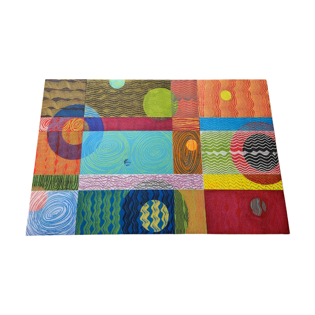 This one of a kind mat is hand painted with bright colors and is as functional as it is beautiful! Measures 24" x 38". Clean regularly with a slightly damp, clean soft cloth and wipe dry. Care instructions included. Handcrafted in US.