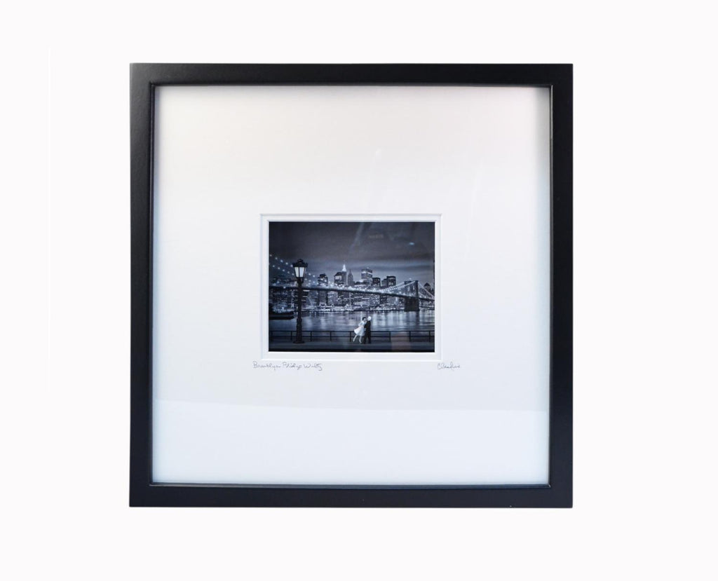 Welcome to the whimsical world of Christine Rodrigues! Handcrafted and arranged by the artist, each shadowbox gives a unique view into a moment in miniature, frozen in time. This 13x13 inch shadowbox depicts a man and a woman dancing by a street light, with the Brooklyn Bridge in the background. The shadowbox is lit internally by a battery operated light, which can be switched on and off by the button at the top of the frame. Battery is held in a hidden compartment in the back of the piece. Handcrafted in the US.