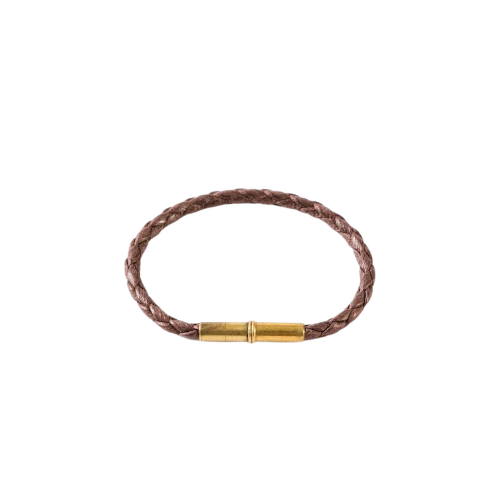 This Flint bracelet by Aaron Boyd of Tres Cuervos gives a rustic and rugged look to any outfit. Made with brown braided waxed canvas cord, and the magnetic closure is made with reconditioned .22 shells. Measures approximately 8". Limit contact with water. Canvas and brass naturally darken over time, and add to the authentic, rustic look. Handcrafted in US.