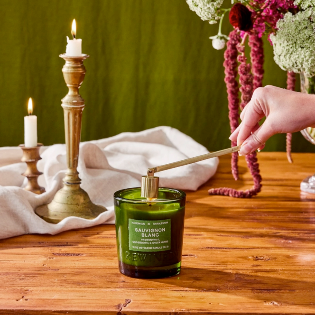 This candle snuffer by Rewined is both beautiful and functional. Blowing out candles without a tool can cause excess smoke, a strong burnt aroma, and even cause hot wax to blow out of the vessel or onto the candle surface. This brushed gold snuffer has a sleek modern straight design for easy use. Measures 6.5" long.