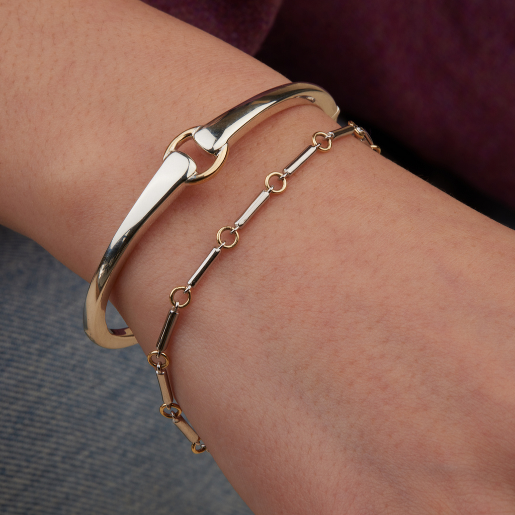 Audry Rose strives to create heirloom jewelry that's unique, yet timeless. Whether you're on the go during the day or going out for the night, their two-tone pieces are effortlessly wearable. This simple buckle bracelet is made with 14k yellow gold and sterling silver. The bracelet fits a 5.9"-6.2" wrist.